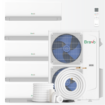 The Bravo Milano Multi-Zone Mini Split Wall-Mounted System offers a sleek, efficient, and reliable solution for personalized climate control in residential or light commercial settings. This 5-zone system features four 9K Btu/h and one 12K Btu/h indoor units connected to a 42K Btu/h outdoor unit, delivering precise heating and cooling exactly where you need it.